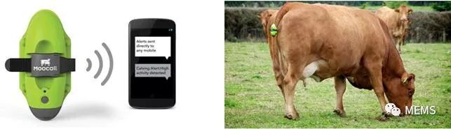 加速度计也用来监测牲畜的活动水平,例如,牛花费多少时间行走、吃饭或躺下休息。通过监测牲畜食用和反刍的时间,确保其获得足够的营养。此外,当母牛排卵时,活动水平急剧增加。这种情况经常发生在夜间,这意味着农民可能无法及时找到一头公牛。实时监测可以检测排卵发生时向农民提前发出警报。九个月或十个月后,农民可以使用“牛叫”(MOOCALL),这种产品使用加速度计来监测由子宫收缩引起尾部运动的独特模式。该系统可以在母牛产犊前一小时左右向农民发送短信。