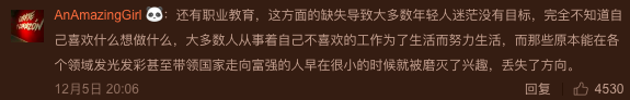 而这条微博下面的最高赞评论则提到了职业教育:“这方面的缺失导致大多数年轻人迷茫没有目标,完全不知道自己喜欢什么想做什么,大多数人从事着自己不喜欢的工作为了生活而努力生活,而那些原本能在各个领域发光发彩甚至带领国家走向富强的人早在很小的时候就被磨灭了兴趣、丢失了方向。”