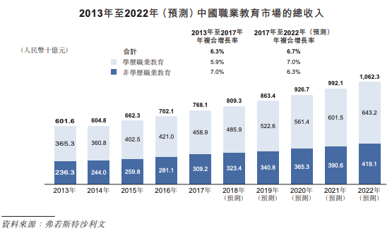 根据教育部资料与弗若斯特沙利文报告,由于培训人次及学费的增加,中国职业教育行业的总收入从2013年的6016亿元人民币增长到2017年的7681亿元人民币,年复合增长率为6.3%,预计至2022年将达到10623亿元。