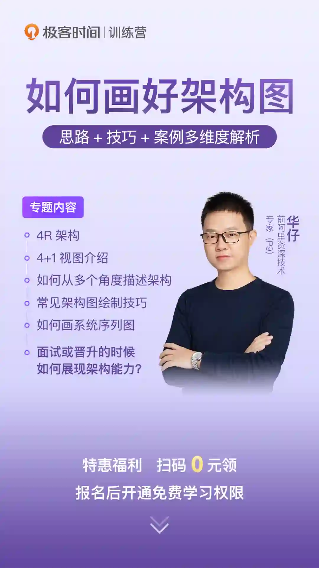 今天给你推荐一个前阿里 P9 华仔的专题分享——《如何画好一张架构图》,从架构及视图类型、系统序列图、绘制技巧并结合案例一一讲解,360°明晰架构图绘制关键要点。