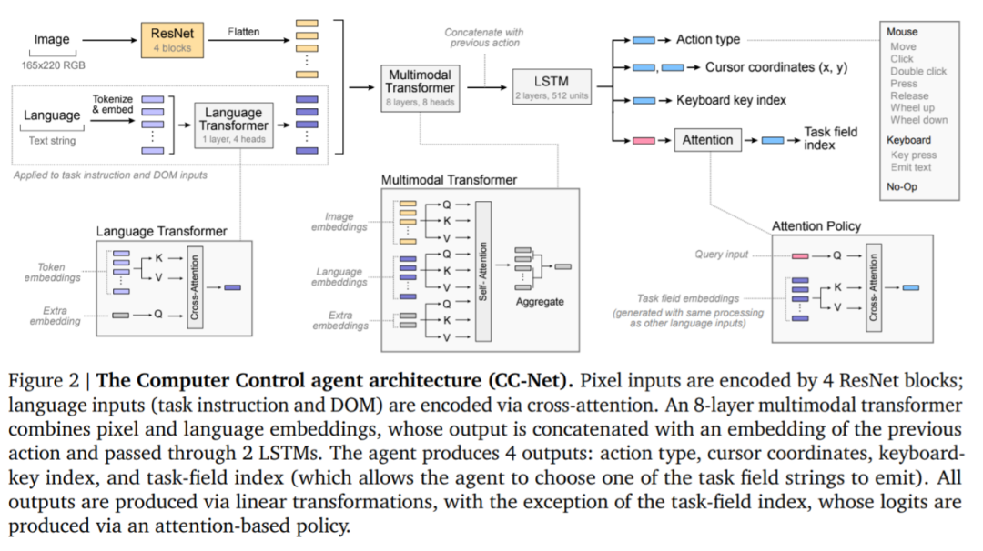 该智能体使用像素和 DOM 信息,并且可以配置为支持一系列不同的操作。该研究进行了消融实验以了解各种架构选择的重要性。