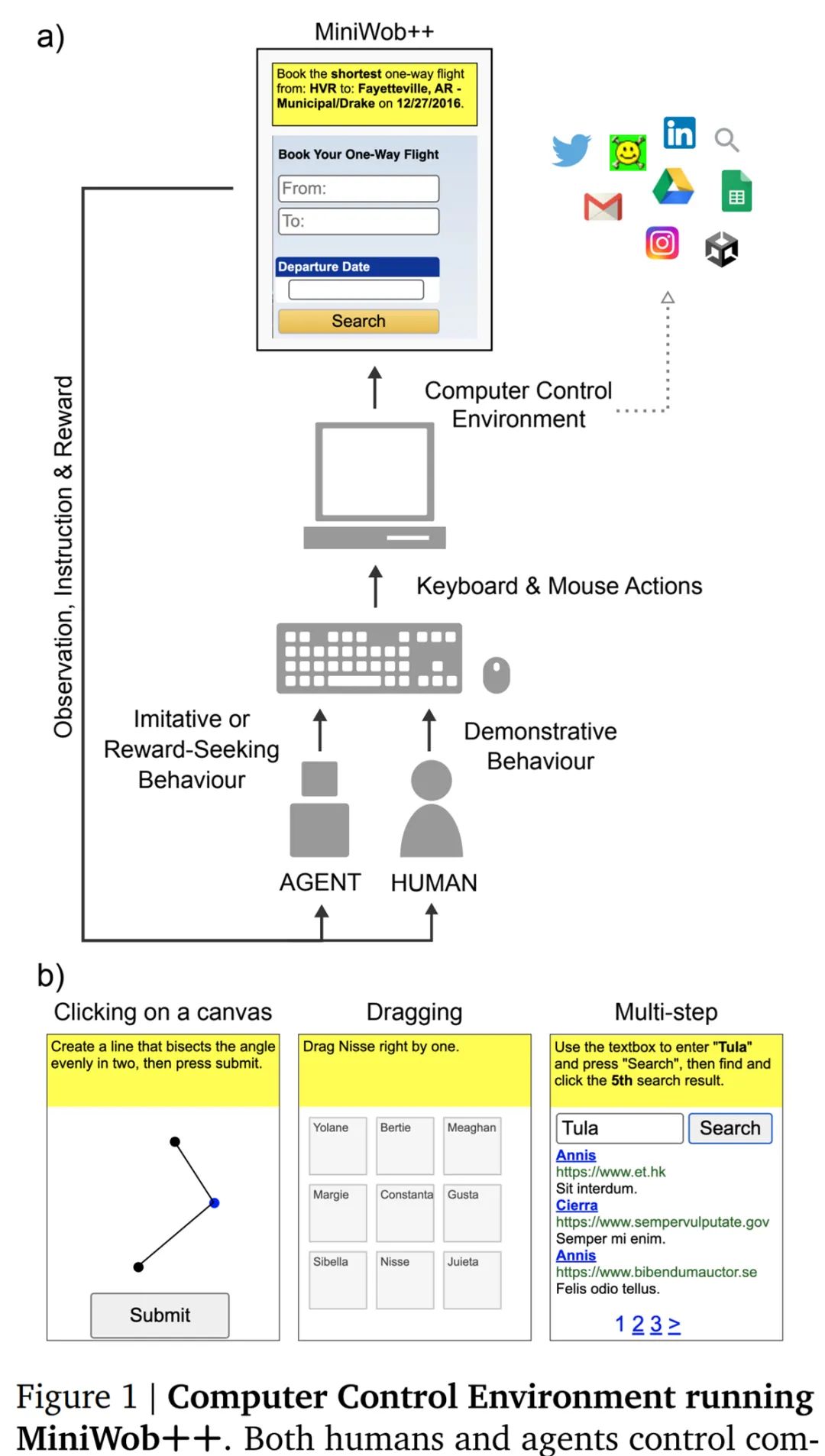DeepMind 对计算机控制进行初步调查采用的基准是 MiniWob++ 任务套件(一组具有挑战性的计算机控制问题),它包含一组执行点击、打字、填写表格和其他此类基本计算机交互任务的指令(下图 1 b)。MiniWob++ 进一步提供了以编程方式定义的奖励。这些任务是迈向更开放人机交互的第一步,其中人类使用自然语言指定任务并提供有关性能的后续判断。