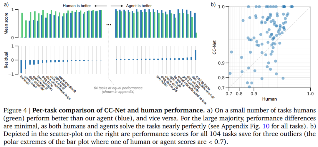研究者发现,虽然该智能体的平均性能与人类相当,但有些任务人类的表现明显优于该智能体,如下图 4 所示。