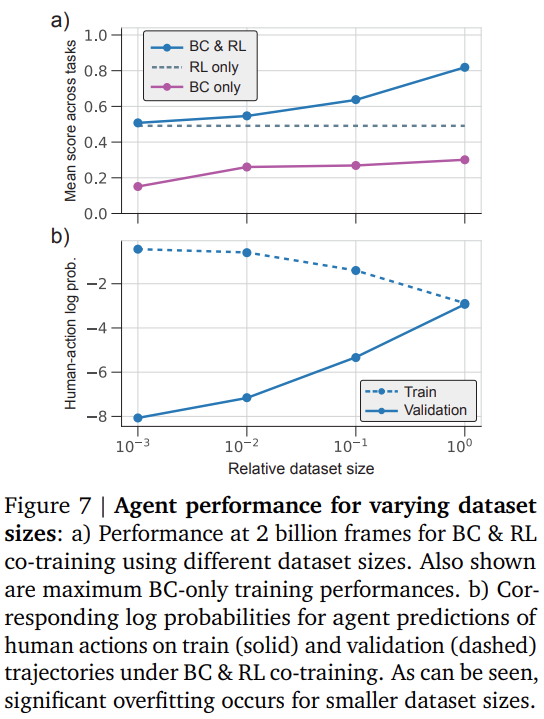 如下图 7 所示,人类轨迹数据集(human trajectory dataset)的大小是影响智能体性能的关键因素。使用 1/1000 的数据集,大约相当于 6 小时的数据,会导致快速过拟合,并且与仅使用 RL 的性能相比没有显著提升。随着该研究将此基线的数据量增加到三个数量级直至完整数据集大小,智能体的性能得到了持续的提升。