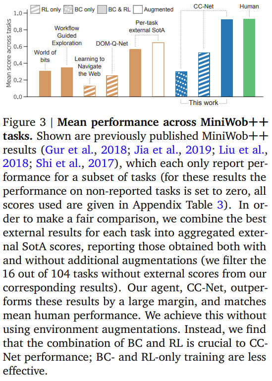 此外, 该智能体在 MiniWob++ 任务组件中实现了人类水平的平均性能。这种性能是通过结合 BC 和 RL 联合训练来实现的。