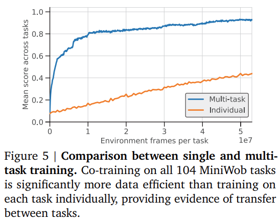 研究者发现,与在每个任务上单独训练的智能体相比,在 MiniWob++ 的全部 104 个任务上训练一个智能体可以显著提升性能,如下图 5 所示。