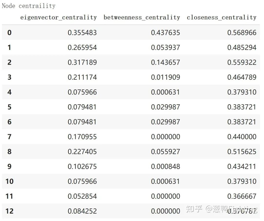 # 打印查看各种节点中心性数值# 各个中心性函数返回的是字典类型数据,key为节点index,value为中心性数值print("Node centraility")eigen_dict = nx.eigenvector_centrality(G)betw_dict = nx.betweenness_centrality(G)close_dict = nx.closeness_centrality(G)centrality_df = pd.DataFrame( { 'eigenvector_centrality': [eigen_dict[v] for v in G], 'betweenness_centrality': [betw_dict[v] for v in G], 'closeness_centrality': [close_dict[v] for v in G], })centrality_df