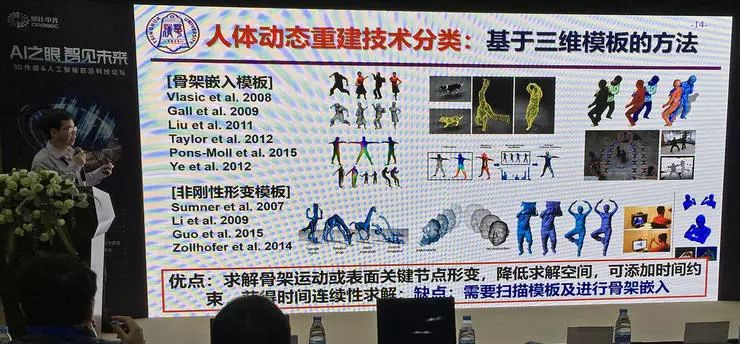 刘烨斌副教授首先介绍了人体动态重建课题中的一些基本概念。在人体动态重建中,需要捕捉的信息有三维的几何+纹理,还有它们的运动;运动包括几何体表面的运动和内部骨架的运动。