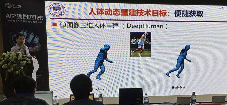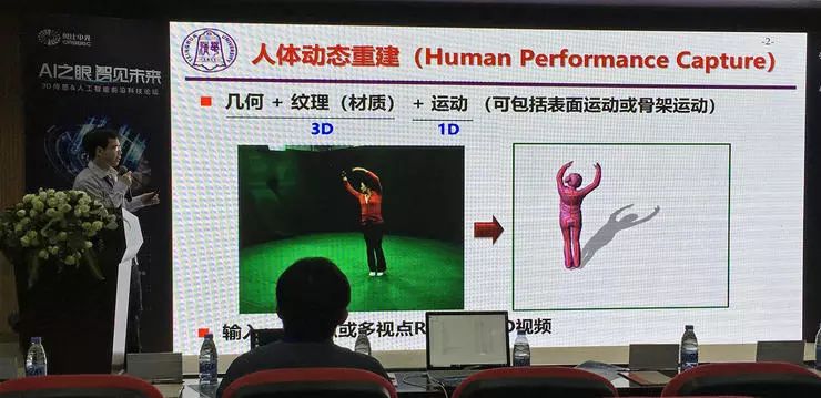 论坛第一个学术报告来自清华大学自动化系副教授、博导刘烨斌。他的报告题目是「人体动态重建技术前沿」。报告对人体动态重建这一研究课题,围绕便捷性和实时性两大目标的学术界相关研究成果回顾了技术发展历程,做了全方位的技术介绍。