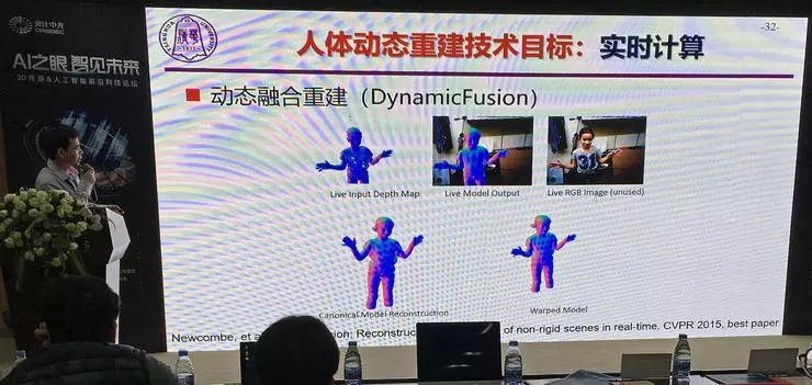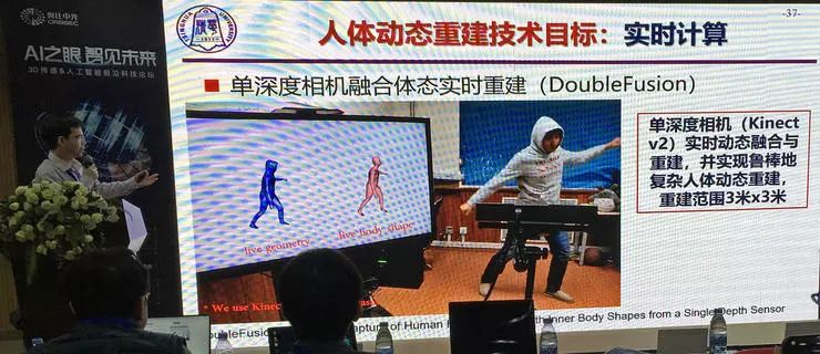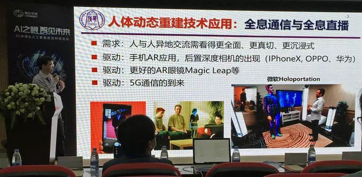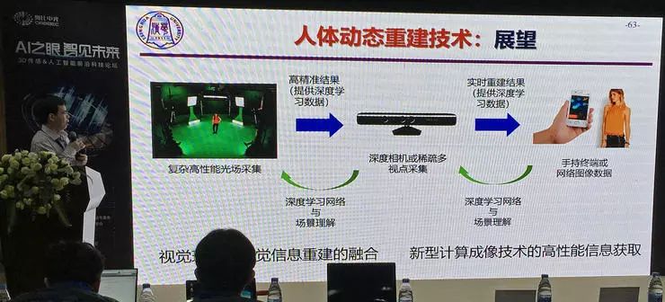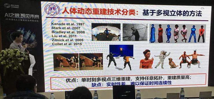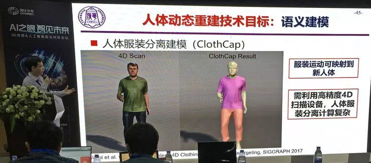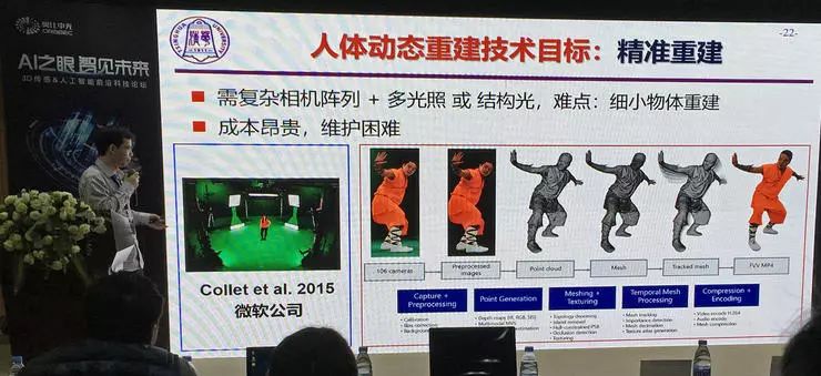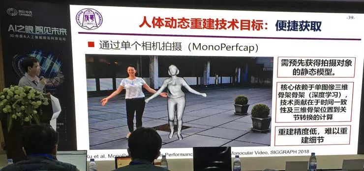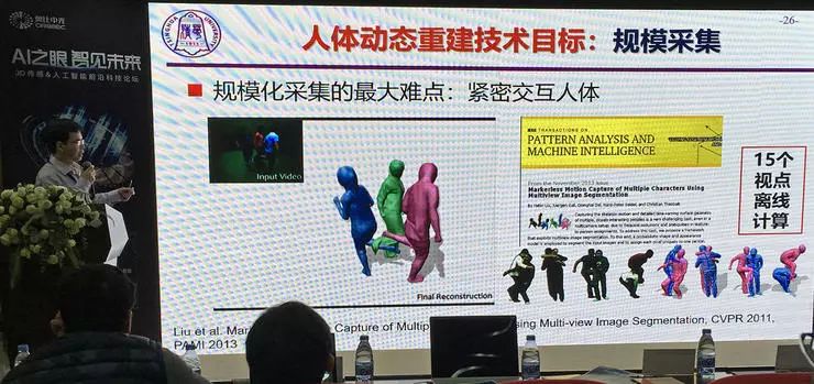 刘烨斌副教授介绍了重建技术中的六大目标:精准重建、规模采集(多人,大采集范围)、便捷获取、实时计算、语义建模(以便建模后结果的迁移)、真实生成。