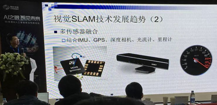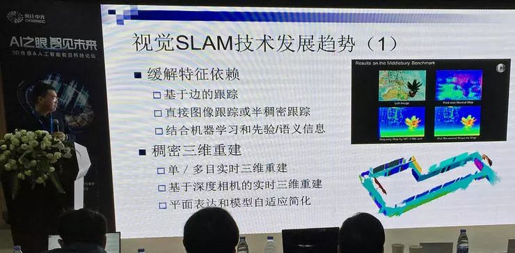 最后,章国锋教授展望了视觉 SLAM 的技术发展趋势。一方面,我们需要更先进的方法缓解视觉 SLAM 中的特征依赖,提高稳定性;另一方面,稠密 SLAM、TOF 做得还不够好、应用还不多。最后,多传感器融合也是一大发展方向。