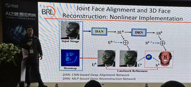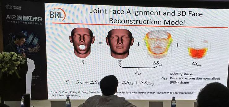 赵启军副教授介绍了自己团队的一项后续研究工作,从单张图像重建三维人脸,同时目标让重建结果帮助人脸识别,排除表情之类的对识别无帮助的信息。他们的思路是把每个面部三维模型看作平均模型+身份信息+表情信息的组合。他们把面部对齐(获得更准确的特征点)和面部重建(获得更准确的三维模型)作为联合任务,交替进行,多次迭代;最终输出的三维重建结果不包含表情信息,也就是一个表情中性的人脸。