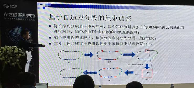 章国锋教授着重介绍了系统中使用的集束调整方法,把长序列分成多个短序列,分段优化,收敛快。在演示视频中,章国锋教授在自家小区中一边行走,一边随意用手机拍摄视频,他们的方法就能很好地重建出周围环境的三维模型,效果优于此前的方法。