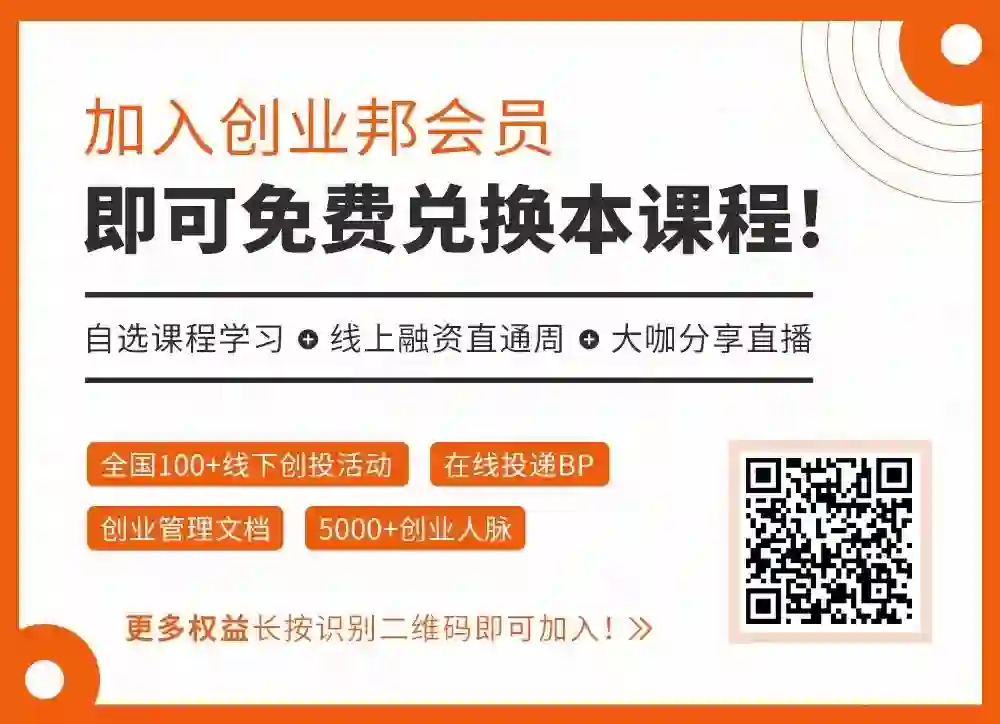PS:现在加入创业邦会员,只要1098!本课程立即免费兑换!5000+创业人脉、行业、地区各个社群资源对接;创业文档大礼包;免费参加创业邦全年3次峰会及无限次参加全国12座城市线下所有活动!扫码即可加入!