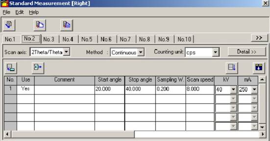 双击Condition下面的1,进入到测量条件的设置界面,根据所测试样品要求,设置Start Angle(起始角)、Stop Angle(终止角)、Scan speed(扫描速度)等参数(注意:一般扫描电压和扫描电流这些参数不要更改)