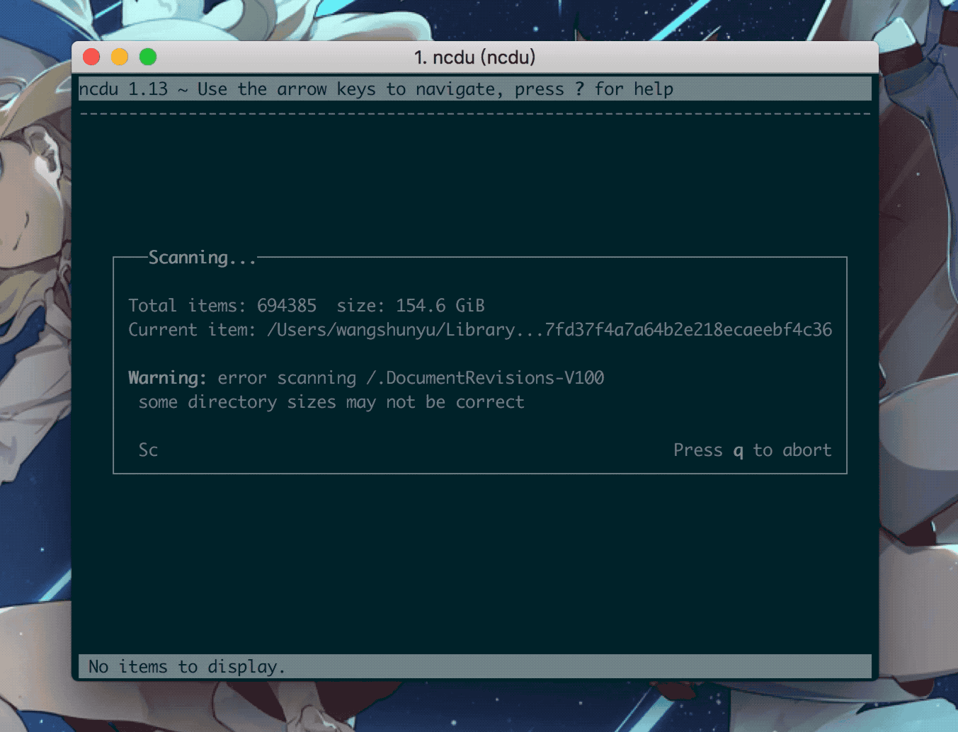 如果你安装了 Homebrew(详细介绍请戳这里),可以直接在终端里输入 brew install ncdu安装。接着,输入 ncdu,其就会自动开始扫描全部磁盘信息,大约需要数分钟就能完毕。