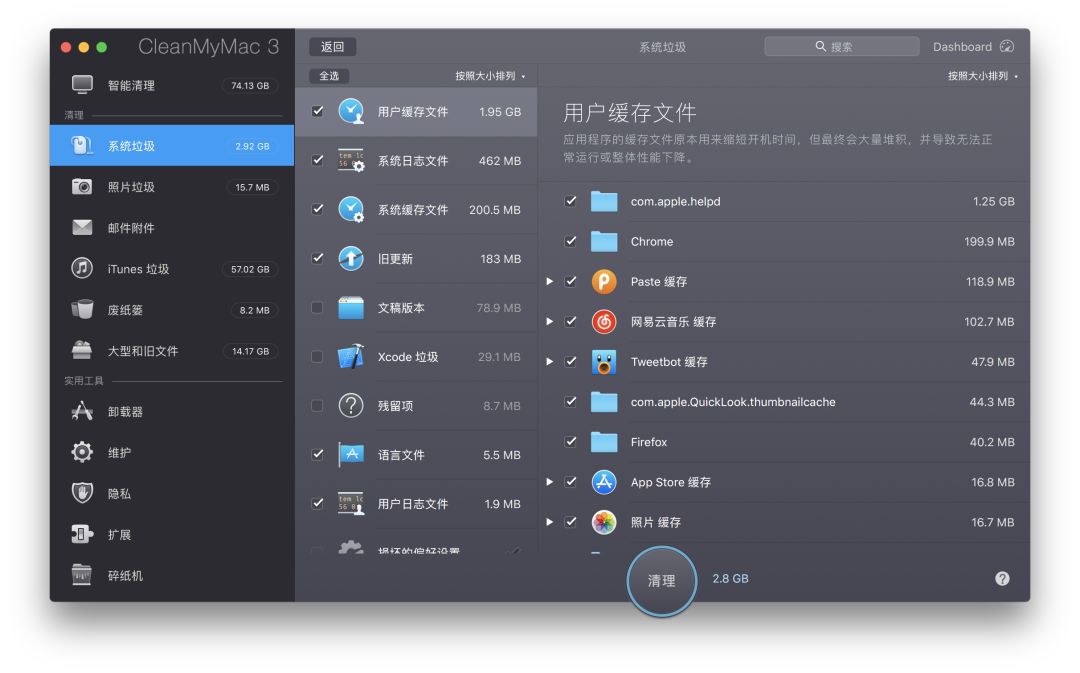 CleanMyMac 3 由 macOS 知名开发商 MacPaw 出品,涵盖垃圾清理、系统维护、文件粉碎等众多实用功能。只要点击底部扫描按钮,等待一小会,你就能获知 Mac 内的缓存、日志、临时文件、iTunes 和照片资料库等占用情况,并一键智能清理。