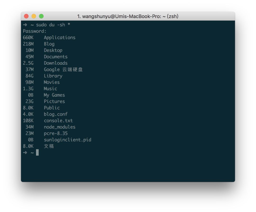 如果你不想额外安装 App,可以打开终端,键入 sudo du -sh *,按下回车后系统就会自动统计该目录下所有文件的占用情况,一般等待一两分钟后就能得到结果了。