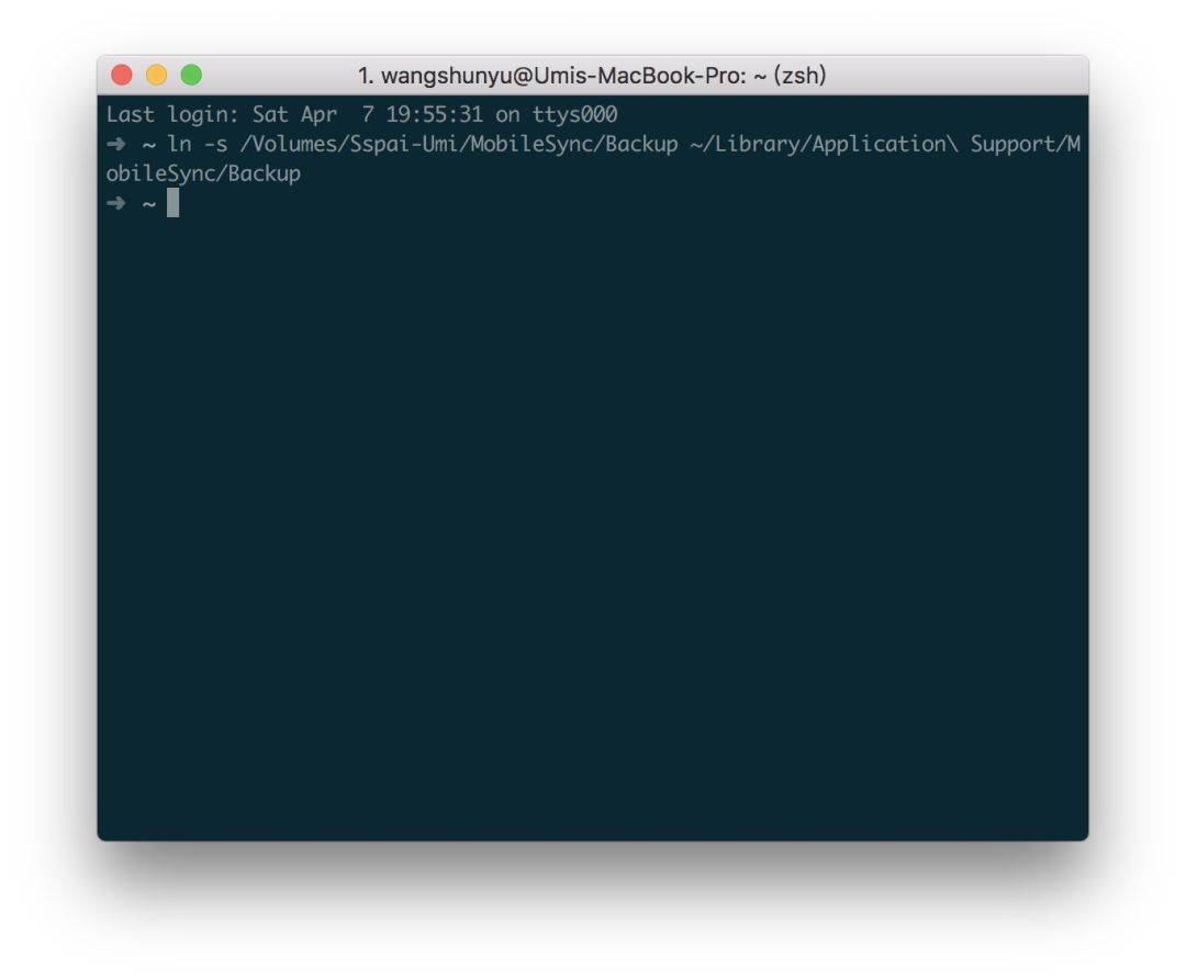最后,在外接磁盘根目录上创建一个名为 MobileSync 的文件夹,在里层创建一个名为 Backup的文件夹。打开终端,输入 ln -s /Volumes/外接磁盘名称/MobileSync/Backup ~/Library/Application\ Support/MobileSync/Backup并回车。