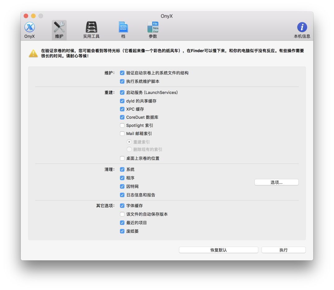 Onyx 是一款极其强大的 macOS 专业系统维护管理工具,受到不少 Power User 的青睐。仅仅在「维护」这一个选项卡中,你就会发现维护文件系统、重建服务功能、清理各类缓存等各类深度优化选项,简单实用。