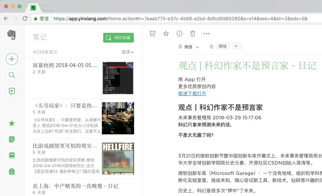 除了卸载低频应用外,我们还可以使用浏览器代替一部分高频应用。例如,我对印象笔记的定位是一款全能收藏服务,而非数字笔记应用。因此,我并不依赖原生 App 所提供的笔记快捷键,而印象笔记 Web 版从 UI 到响应速度等各方面的体验几乎都优于 App。这种情况下,将印象笔记网页固定在浏览器标签栏上随时访问或许更为合适。