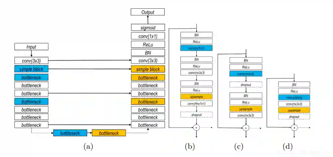 (d)仅长跳连接具有7个重复的简单块,没有BN。