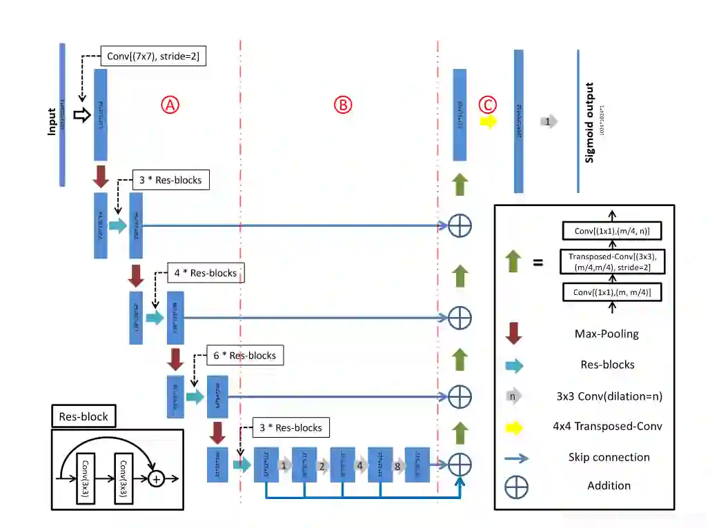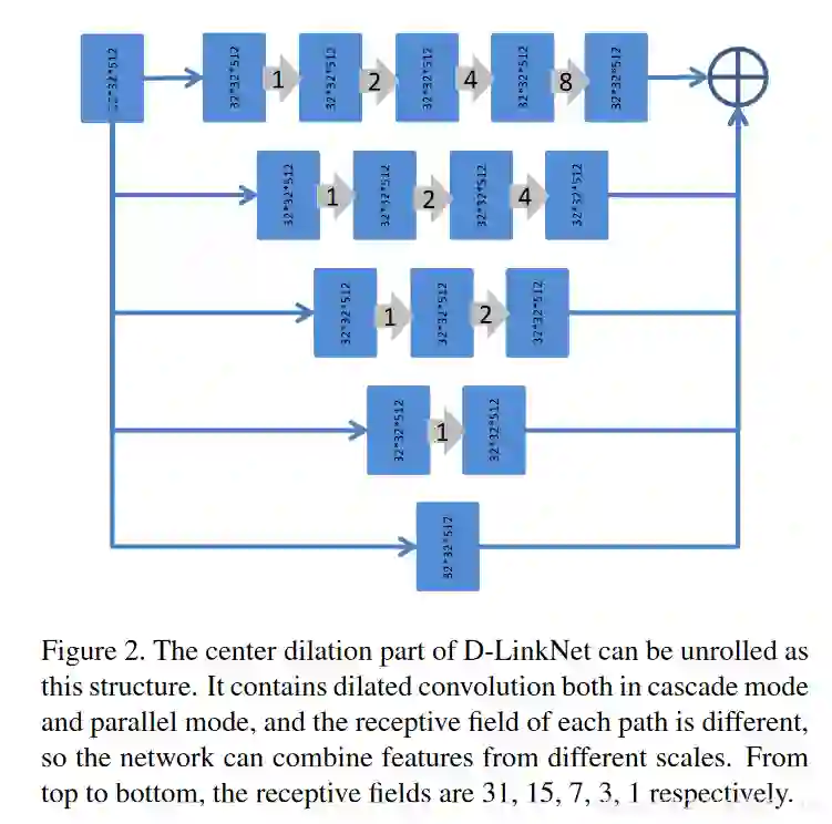 D-LinkNet使用LinkNet作为基本骨架,使用在ImageNet数据集上与训练好的ResNet作为网络的encoder,并在中心部分添加带有shortcut的dilated-convolution层,使得整个网络识别能力更强、接收域更大、融合多尺度信息。网络中心部分展开示意图如下: