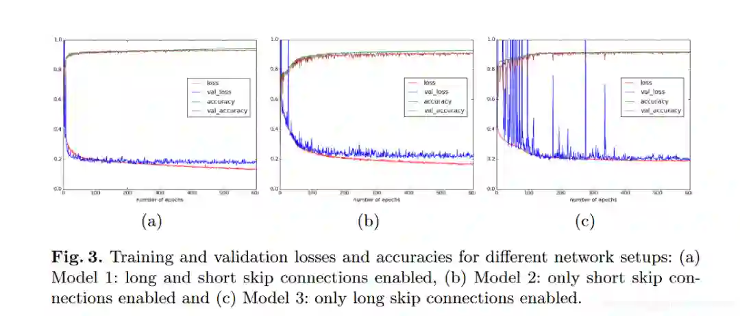 下面的Figure3为我们展示了长短跳过连接,以及只有长跳过连接,只有短跳过连接对准确率和损失带来的影响: