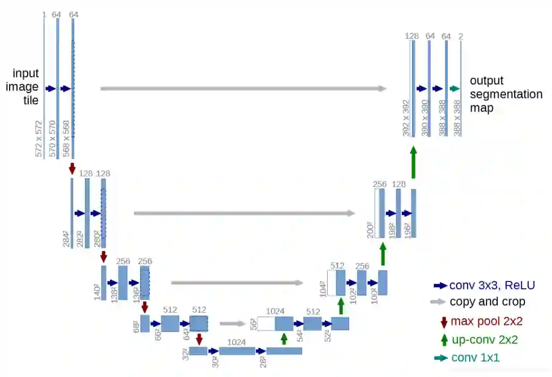 并且从收缩路径到扩展路径之间存在很长的跳过连接。