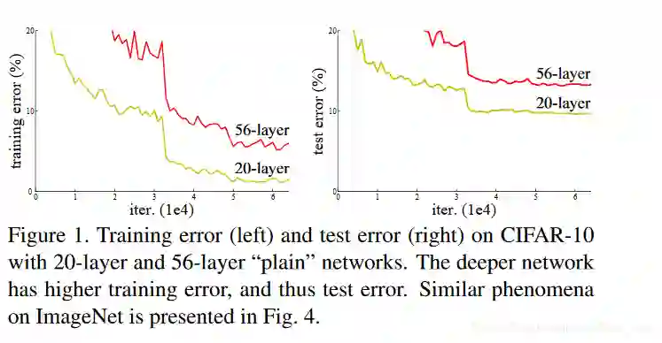 在ResNet之前普遍认为网络的深度越深,模型的表现就更好,因为CNN越深越能提取到更高级的语义信息。但论文的实验发现,通过和浅层网络一样的方式来构建深层网络,结果性能反而下降了,这是因为网络越深越难训练。实验如Figure1所示: