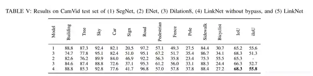 这项工作的主要贡献是在原始的UNet中引入了残差连接,并直接将编码器与解码器连接来提高准确率,一定程度上减少了处理时间。通过这种方式,保留编码部分中不同层丢失的信息,同时,在进行重新学习丢失的信息时并未增加额外的参数与操作。在Cittycapes和CamVID数据集上的实验结果证明残差连接的引入(LinkNet without bypass)使得mIOU获得了提升。