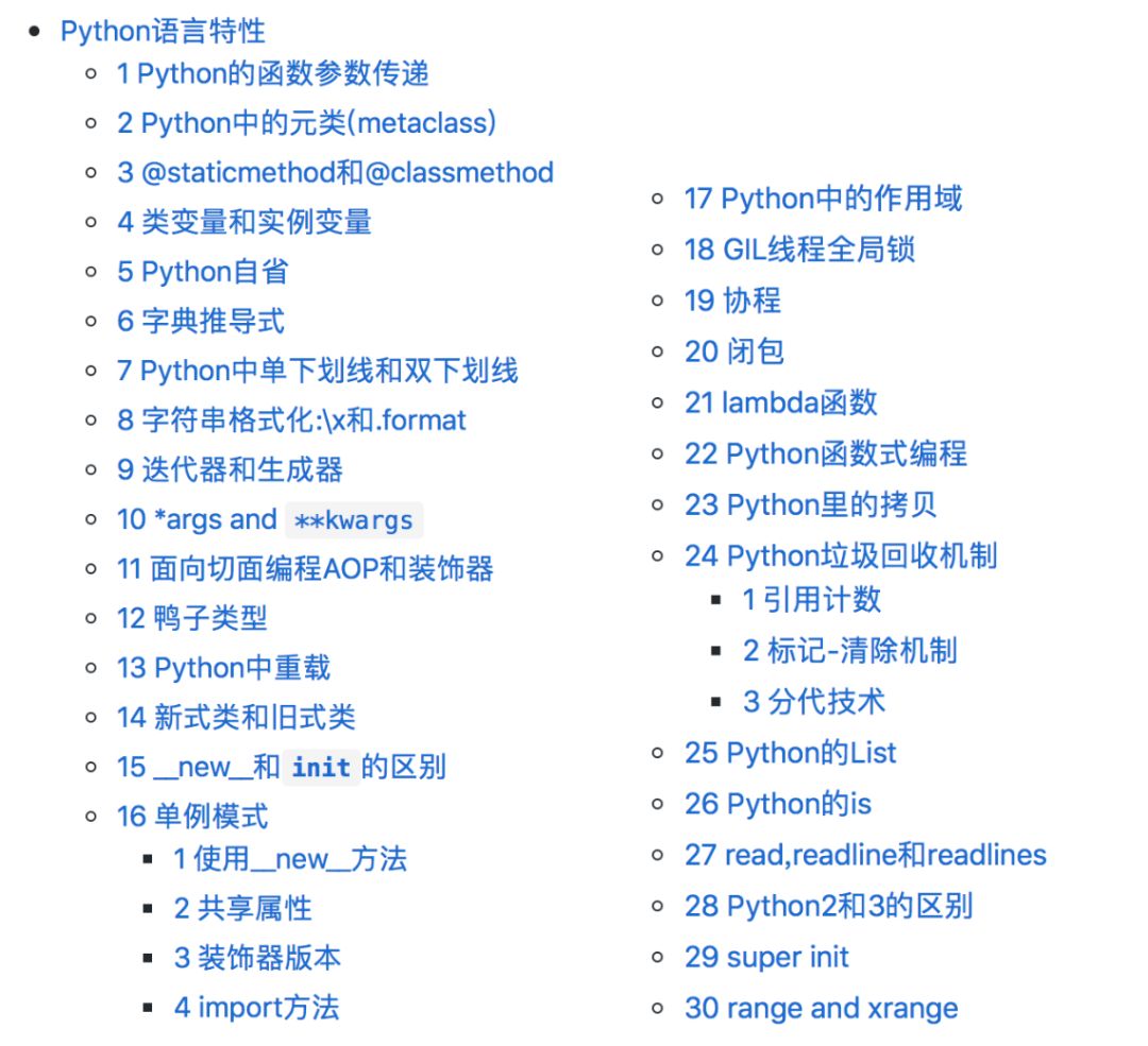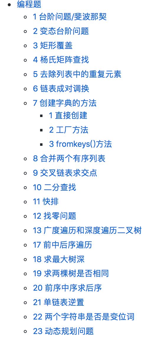 接下来,我们看看都包括哪些内容,我们为大家分成了三类:1.关于 Python 这门语言总结的一些重要问题,并给出了示例代码供大家分析理解;2.总结了一些算法的编程题;3.在面试中其他的一些知识点的掌握与阐述;