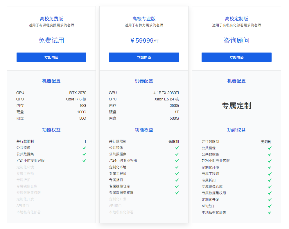免费申请。同时矩池云还推出了高校专业版和高校定制版,来满足校园教育场景下对深度学习平台的不同需求。
