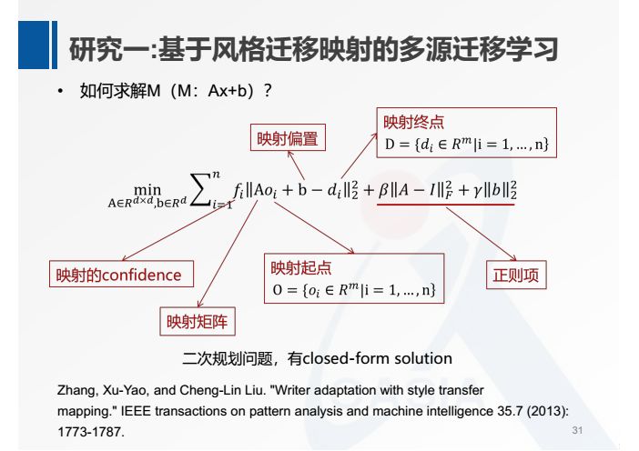 我们受刘成林老师发表在PAMI上的文章启发,原有工作是字符识别中针对不同字体风格的迁移,其映射方式是仿射变换。上图是我们定义的目标函数,o相当于源,d相当于映射终点,后面两个是正则项。这个目标函数是二次规划的问题,可以有一个解析解。