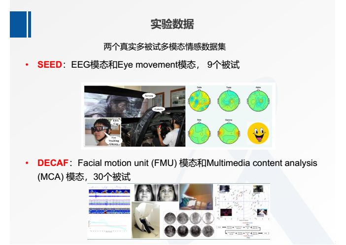 上图是实验数据,不仅有EEG还有眼动数据,但是眼动数据量少一些,只有9个被试。另外还有人脸表情的数据,有30个被试,这都是多模态数据集。