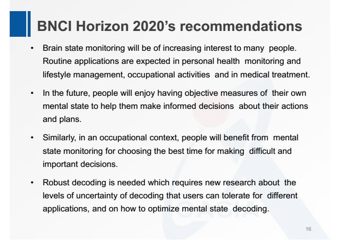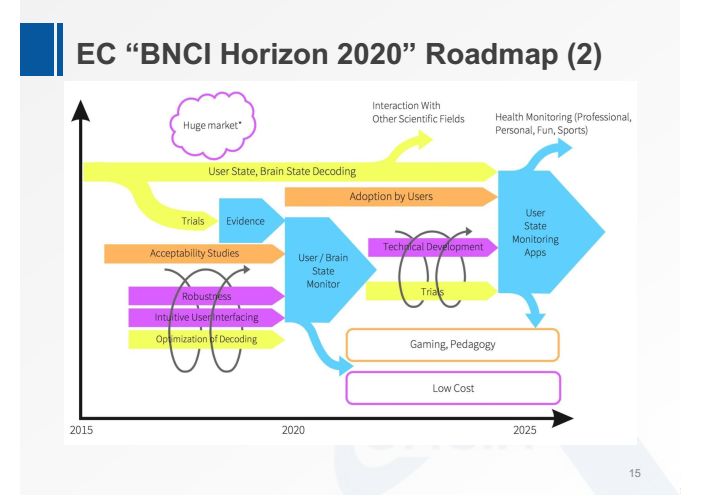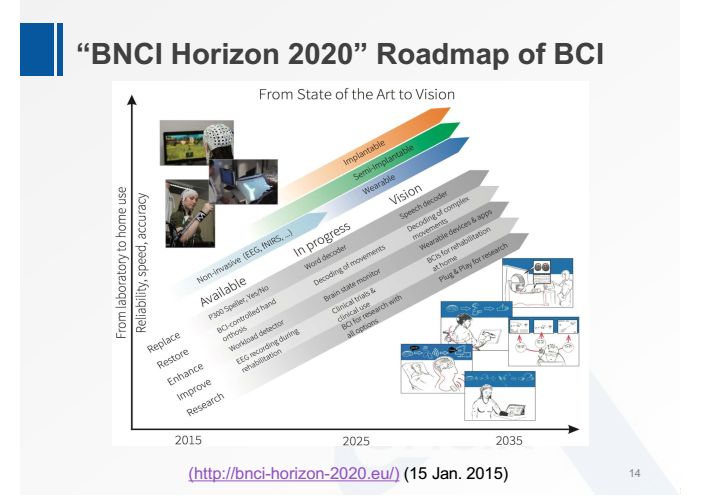 上图是欧洲关于脑机接口发展的路线图,是Horizon2020的计划,涉及脑机接口的研究、提高、增强、恢复和替代。