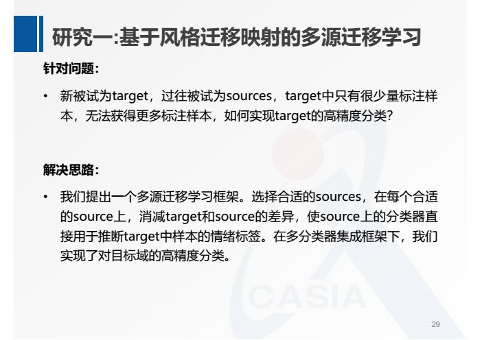 现在要考虑它的应用场景。比如说我们针对过往被试训练了模型,现在有了一个只有少量标注的新被试,我们如何基于过往被试的模型实现新被试高精度的分类?我们提出一个多源迁移学习框架。选择合适的源,在每个合适的源上,消减目标和源的差异,使源上的分类器直接用于推断目标中样本的情绪标签。在多分类器集成框架下,我们实现了对目标域的高精度分类。