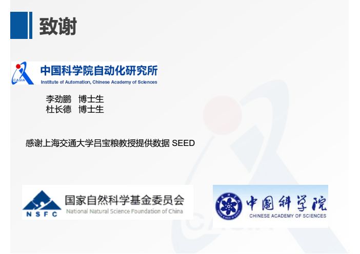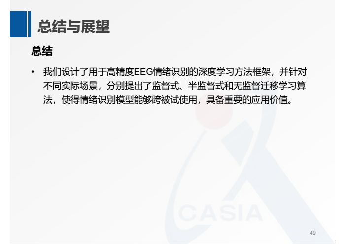 最后做一下总结和展望。我们设计了用于高精度EEG情绪识别的深度学习方法框架,并针不同实际场景,分别提出了监督式、半监督式和无监督迁移学习法,使得情绪识别模型能够跨被试使用,具备重要的应用价值。接下来还有很多方面可以继续探讨,比如远距离的迁移学习,源被试之间如果差异特别大,直接迁移很难,需要从不同被试中选择迁移路径。还有在zero-shot learning,one-shot learning和online learning上的应用都值得继续探讨。