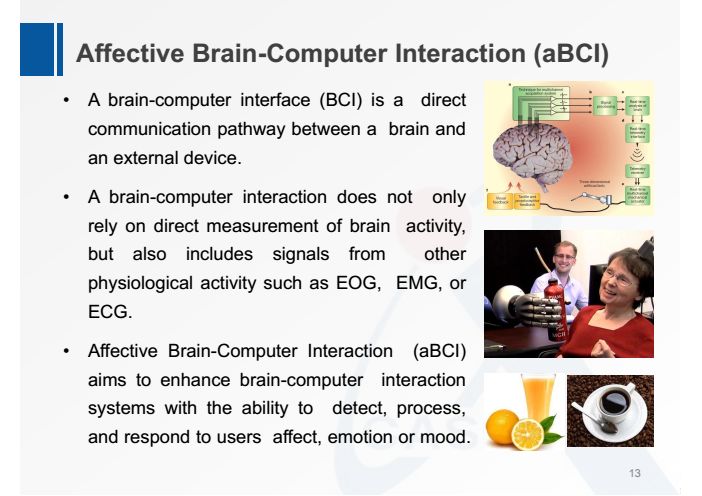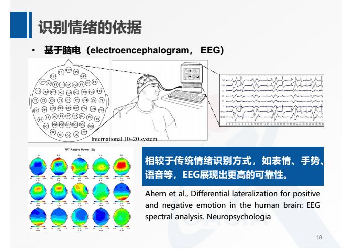 情绪识别中一个新的领域叫做Affective Brain-Computer Interaction,也就是情感的脑机结合。脑机接口在大脑和外界设备之间建立直接的通道。但是,这个脑机接口不仅仅依赖于直接对大脑信号的测量,还包括其他心理、生理的信号,包括机电、眼电、心电等等。