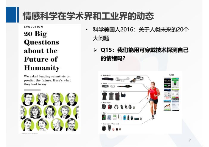 2016年在《科学美国人》上有关于人类未来的20个大问题,其中一个是“我们能用可穿戴技术来探测自己的情绪吗”,说明我们还是希望能够了解自己的情绪。现在经常有人戴手环,使用各种APP,来记录每天走了多少步,吃了多少卡路里的食物,希望借助各种外部探测手段来了解自己。从这个意义上来说人们需要了解自己的情绪,进而来调控情绪。