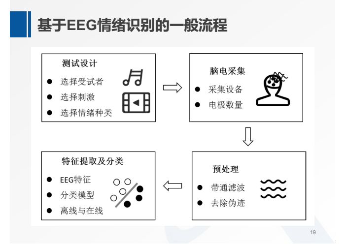 基于EEG情绪识别的一般流程如上图所示。首先,设计实验,找被试者,对他施加一些刺激。然后,对他进行数据采集。接下来是数据预处理和特征提取及分类。
