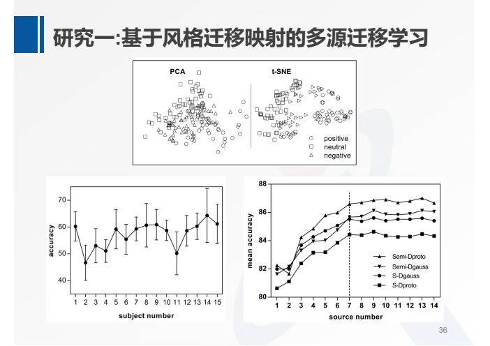 然后我们进行可视化,以前的方法比较难以区分情绪,通过迁移学习后能够比较好地区分开。准确率还与源样本的数目有关系,右下的图体现了选择不同源的个数对分类正确率的影响,我们发现选择7个源就可达到较好的效果,如果选择源的个数太多,会增加计算复杂度。另一方面,如果标签越多性能越好,但我们从上图可以看出,标签数目比较少的时候也能够得到比较好的效果。