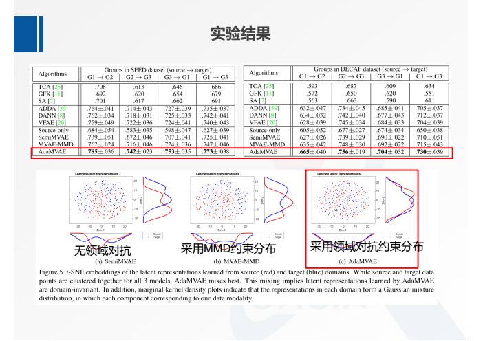 上图红色框里是源领域的变分自编码,蓝色框里是目标领域的变分自编码,他们在隐含层是共享的。我们想学习的这些隐含的表示,使二者隐含表征的距离更小,相当于加了约束。另外一方面,源领域内做分类学习,领域间要对抗,使得两个领域隐含表征分布接近,同时使得隐含表征在源领域内有很好的性能。所以目标函数包括图中三个部分。