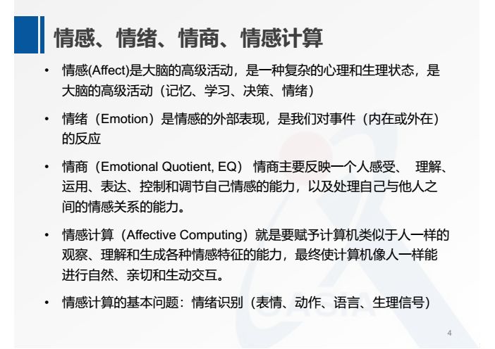 情感是大脑的高级活动,它是一种复杂的心理和生理状态,高级活动包括记忆、学习、决策和情绪等。情绪是情感的一个外部表现,是我们对事件内在或外在的反应。一个成功的人通常要同时具备高智商和高情商。情商反映一个人控制调节自己情感的能力,以及处理自己与他人之间情感关系的能力。情感很重要,它会影响我们做决策。情感计算要赋予计算机像人一样的观察理解和生成情感特征的能力,最终使得计算机像人一样进行自然亲近和生动的交互。情感计算中基本问题包括情绪识别。