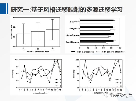 这是迁移学习的结果,比较之前利用的一般的模型,这个模型是把很多被试的数据放在一起进行训练,比如说被试前70%进行训练,后面30%进行测试,得到一个分类器,它相对于单个样本训练模型更加鲁棒。最后结果是三分类情况下平均正确率提升22.8%。