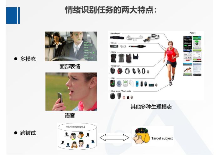 情绪识别任务有两大特点,一个是多模态,模态包括面部表情、语音等各种各样的生理模态。另一个是跨被试,如何从以前的模型迁移到新的模型。