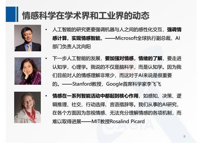 下面介绍一下情感科学在学术界和工业界的动态。微软全球执行副总裁沈向阳认为,人工智能的研究要强调机器人与人之间的感性化交互,强调情感计算,实现情感智能。李飞飞教授认为要加强对情感情绪的了解。MIT的Rosalind教授认为情感在一系列智能活动中都起到核心作用,如感知、决策、逻辑推理、社交、行动选择、言语措辞等。AI研究如果忽视情感,就难以取得进展。