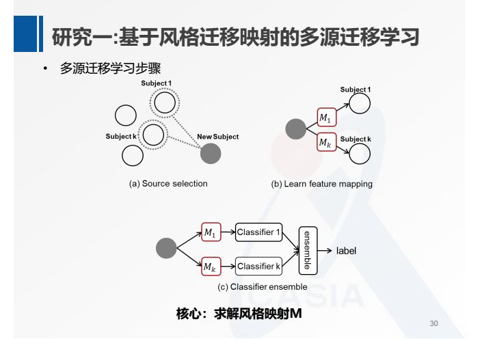 这个过程包括这样上图三个步骤。首先,我们有很多个源,来了新被试后,要从以前被试者中选择合适的然后迁移到新的被试上,也就是进行源的选择。第二步是特征映射,把以前的源和现在的目标之间建立一个映射关系,这里通过一个变化矩阵学习M,新被试可以通过M映射回来。最后,将以前的分类器集成得到这个标签。核心问题是如何学习M。