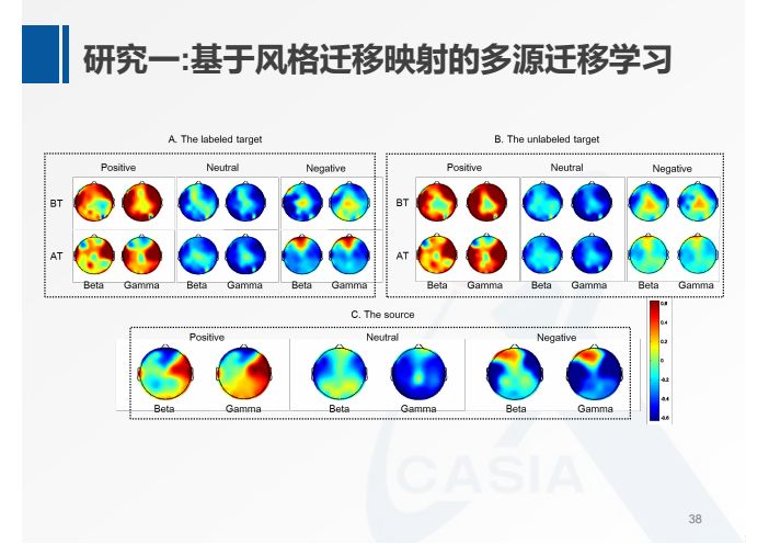 我们把学到的标签映射回脑地形图,进行可视化。我们在脑电上观察,源和目标在处理前很不相似,但迁移之后比较相似。在我们提出的方法中,仅需采集新被试的少量标注样本,就能使现有模型直接用在新被试,具备重要的实际应用价值。本方法要求新被试的少量标注样本,在此基础上,也可以利用新被试的无标注样本,可在监督学习及半监督学习下工作。在迁移中使用多个源,可有效提升模型的泛化能力。这个工作已经被IEEE Trans. On Cybernetics接收。