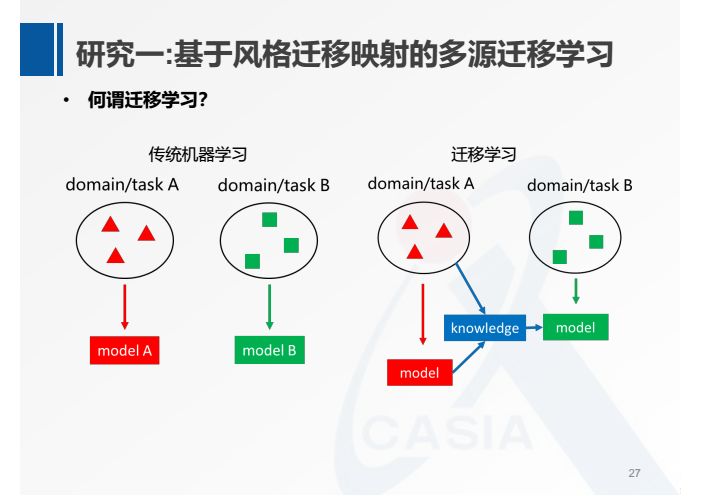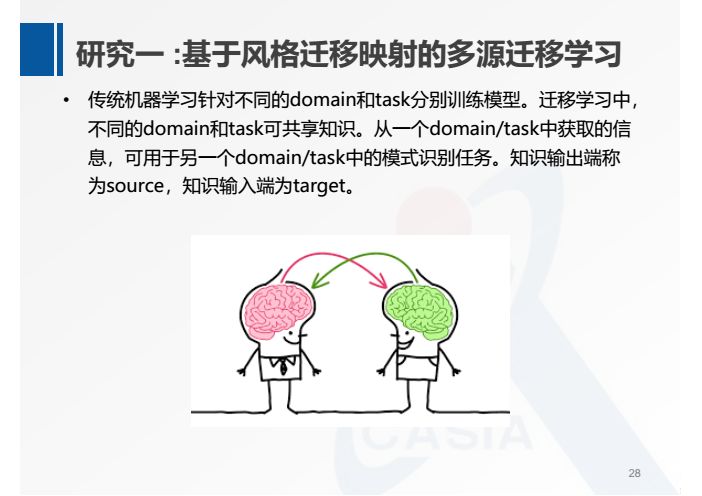 我们做的是基于风格迁移映射的多源迁移学习。传统机器学习是在不同领域或任务上分别训练模型,迁移学习不同的领域和任务共享知识。我们把知识输出端称为源(source),输入端称为目标(target)。